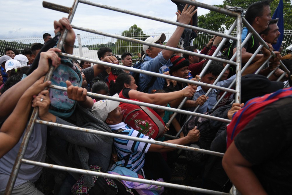 Los hondureños, que intentan escapar de la violencia y pobreza en su país, superaron al grito de “¡Sí se puede!” una barrera de decenas de policías y militares que se apostaron con vehículos blindados. También lograron, entre gritos y empujones, derribar una valla metálica que les impedía el paso hacia la frontera.