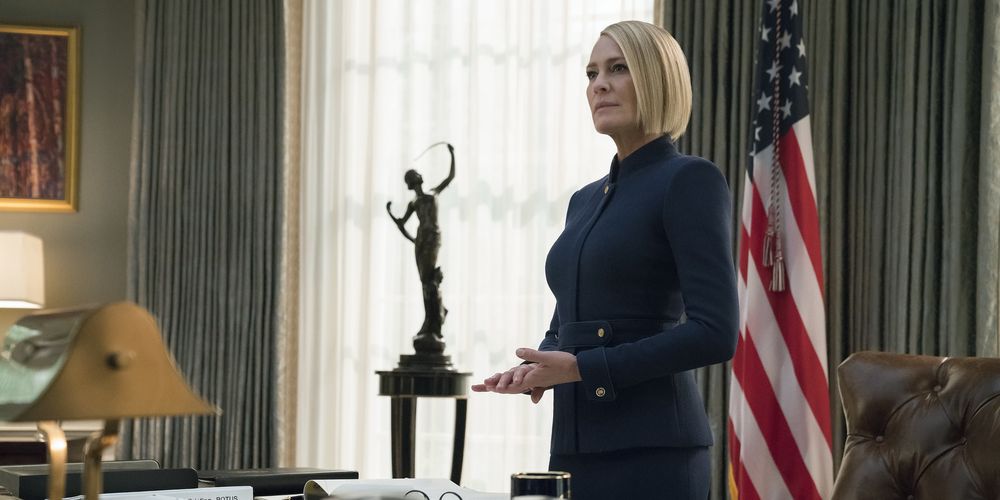 En el final de la última temporada, la esposa de Frank, Claire, interpretada por Robin Wright, mira a la cámara y declara “mi turno”, ya que el poder cambia de manos y ella se convierte en la primera presidenta mujer de Estados Unidos.