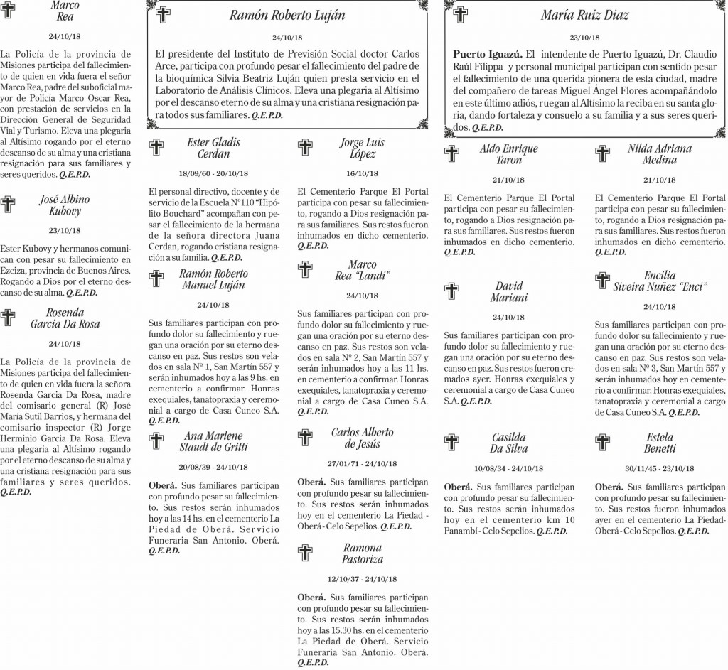 Fúnebres del jueves 25 de octubre de 2018