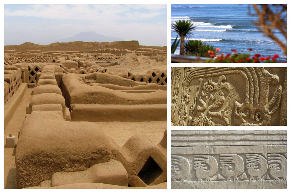Es la ciudad de barro más grande de la América prehispánica y fue declarada Patrimonio Cultural de la Humanidad por la UNESCO en 1986. La que fuera la capital del reino Chimú, albergó más de 100 mil talleres, calles, murallas y templos piramidales en un espacio de 20 kilómetros cuadrados. Sus enormes muros están decorados con relieves de figuras geométricas, estilizaciones zoomorfas y seres mitológicos. El recorrido se complementa con la visita al Museo de Sitio.