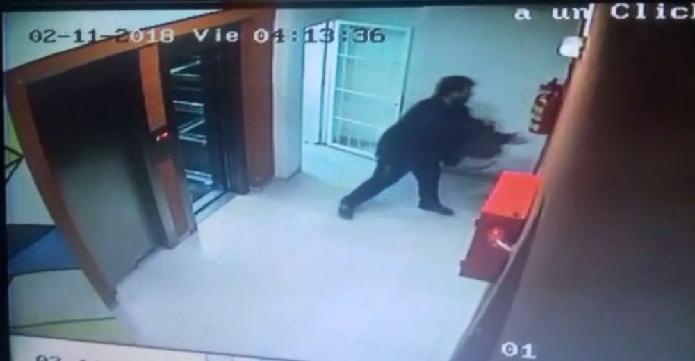 Tal como quedó registrado en las cámaras de seguridad del edificio “Juan Pablo V”, emplazado en el corazón de Villa Sarita y a metros del Club Deportivo Guaraní Antonio Franco, habría sido el sospechoso quien minutos después de las 4 ingresó al hall y, tras cerciorarse que el encargado se encontraba limpiando, robó el matafuego, lo escondió en la mochila y regresó a la calle como si nada.