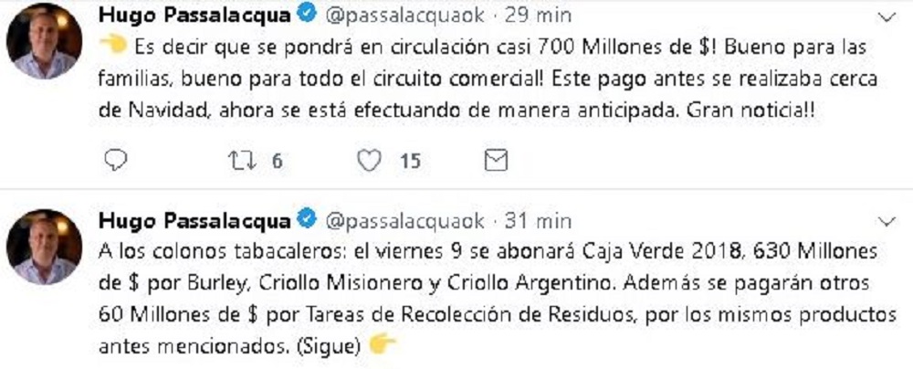 “A los colonos tabacaleros: el viernes 9 se abonará Caja Verde 2018, 630 millones de pesos por Burley, Criollo Misionero y Criollo Argentino. Además se pagarán otros $60 millones por Tareas de Recolección de Residuos, por los mismos productos antes mencionados”, detalló el gobernador Hugo Passalacqua.