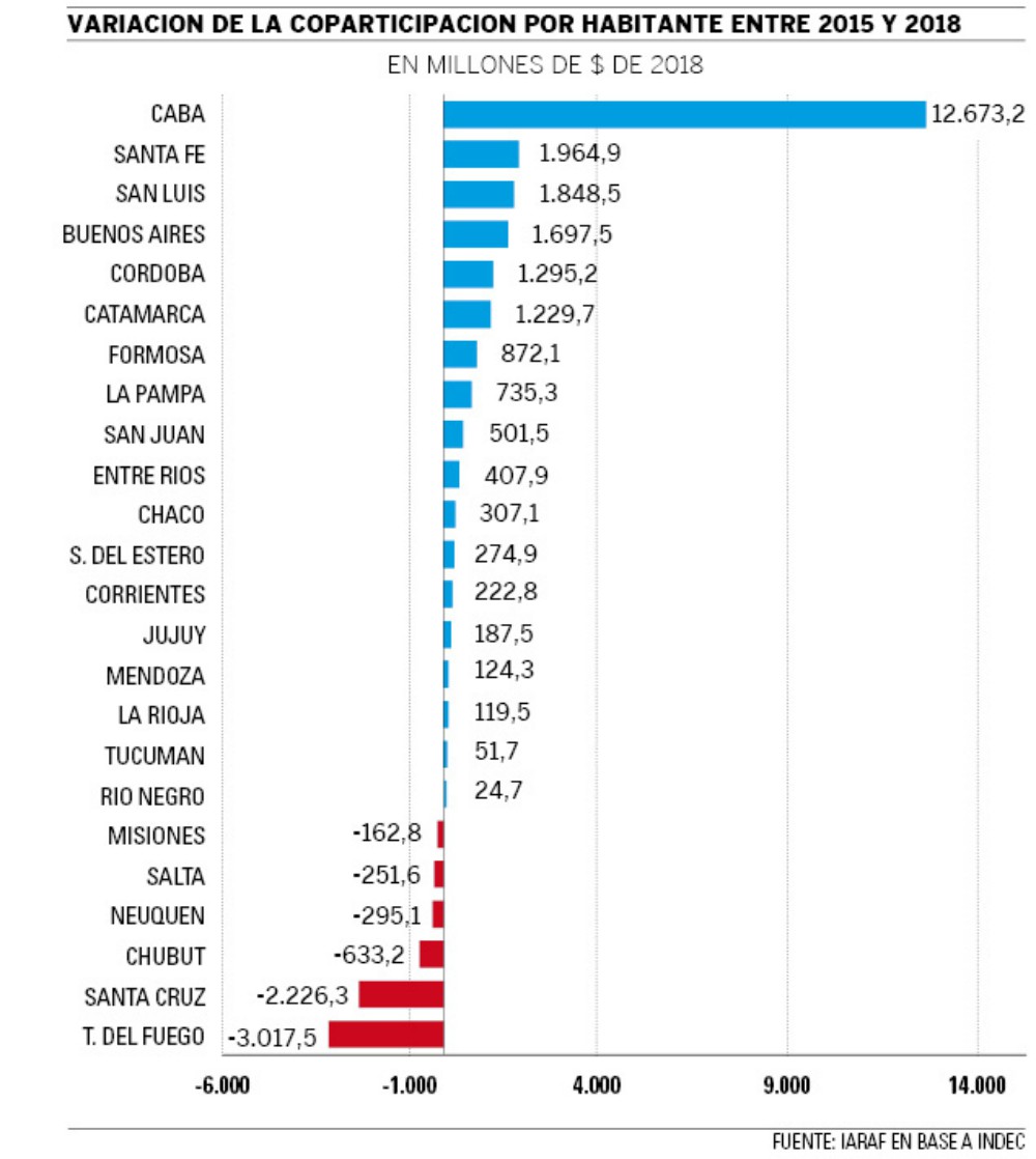 Los datos surgen de un informe elaborado por el Instituto Argentino de Análisis Fiscal (IARAF) donde presentan “la variación que tendría la coparticipación por habitante entre los años 2015 y 2018” y remarcan que “lo primero que surge es que 18 jurisdicciones recibirían más coparticipación por habitante y 6 jurisdicciones terminarían en una peor situación que 2015”.