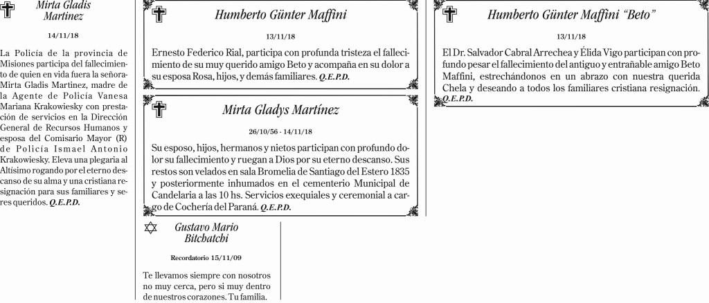 Fúnebres el jueves 15 de noviembre de 2018