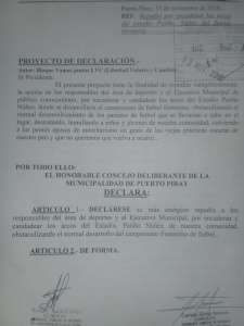 El concejal de Vamos Juntos, Juan Carlos Benítez, presentó en el Concejo Deliberante un proyecto para declarar “el más enérgico repudio al área de Deportes y al Ejecutivo Municipal por encadenar y candadear los arcos del estadio Patiño Núñez de nuestra comunidad, obstaculizando el normal desarrollo del campeonato femenino de fútbol”.