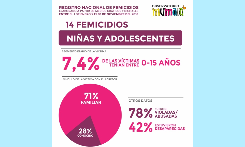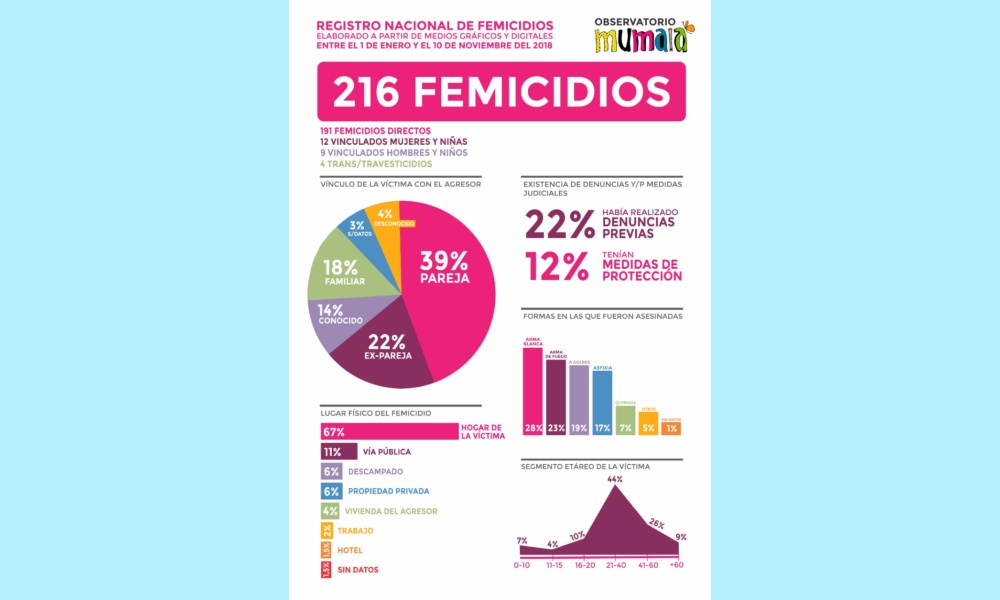 Los números que más duelen: del 1 de enero al 10 de noviembre de 2018 se registraron 216 femicidios en la Argentina, siete de los cuales ocurrieron en Misiones, lo que posiciona a la provincia entre las diez con más mujeres asesinadas por cuestiones de género. Así se desprende del Registro Nacional de Femicidios del Observatorio “MuMaLá”, que se basa en los casos que se publican en los medios gráficos, y que detalla que 191 corresponden a femicidios de mujeres, mientras que hubo 21 vinculados de mujeres, hombres, niñas y niños, y 4 trans/travesticidios.