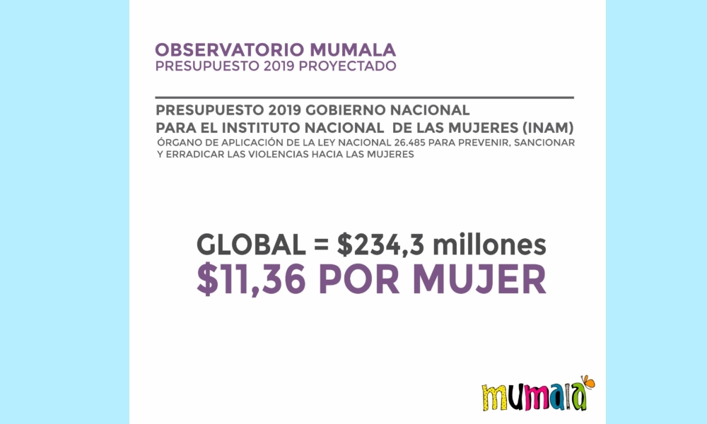 Con estos números escalofriantes, desde MuMaLá criticaron la aprobación del Presupuesto 2019 porque “el Gobierno Nacional destinará 234,3 millones de pesos al Instituto Nacional de las Mujeres (INAM), encargado de la aplicación de la Ley 26.485, es decir, tan sólo 11,36 pesos por mujer. Con la inflación proyectada implica una retracción del 18% con respecto al asignado en 2018. Asimismo, los fondos destinados al monitoreo del Plan Nacional de Acción disminuyó de 50 millones en 2018 a 32 millones para 2019”. Las Mujeres de la Matria Latinoamericana (MuMaLá) “diseñaremos, en el Encuentro Nacional en Rosario el 17 y 18 de noviembre, estrategias federales para exigir al Gobierno Nacional respuestas acordes a la dimensión de la problemática”.