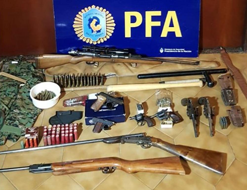 En el domicilio los detenidos ocultaban: una carabina Mauser calibre 7.65 mm con mira telescópica; una escopeta calibre 16; dos revólveres calibre 38 largo; una pistola Bersa calibre 22 largo; un revólver calibre 25; dos revólveres calibre 22; una carabina de aire comprimido; cuatro cuchillos de tipo militar; municiones de escopeta calibre 36 y 16; trece peines con cinco cartuchos cada uno calibre 7.65 y otros 237 cartuchos de distintos calibres; un bastón tipo “tonfa”, ropa de tipo militar y dispositivos electrónicos.