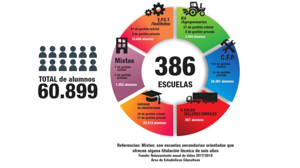 Por otra parte cuenta con 144 centros de formación profesional de gestión estatal y 34 de gestión privada que permiten formar en diferentes profesiones a un total de 24.301 alumnos que transitan por sus aulas en la actualidad.