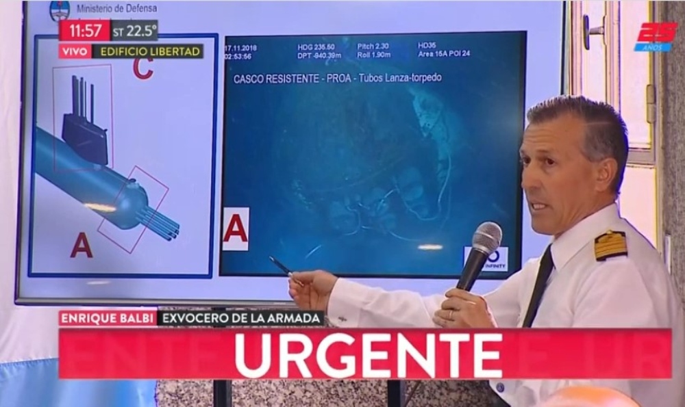 Las imágenes fueron dadas a conocer durante una conferencia de prensa que encabezaron el ministro de Defensa, Oscar Aguad, y el jefe de la Armada, vicealmirante José Luis Villán, y de la que participó el exvocero de la Armada, Enrique Balbi.