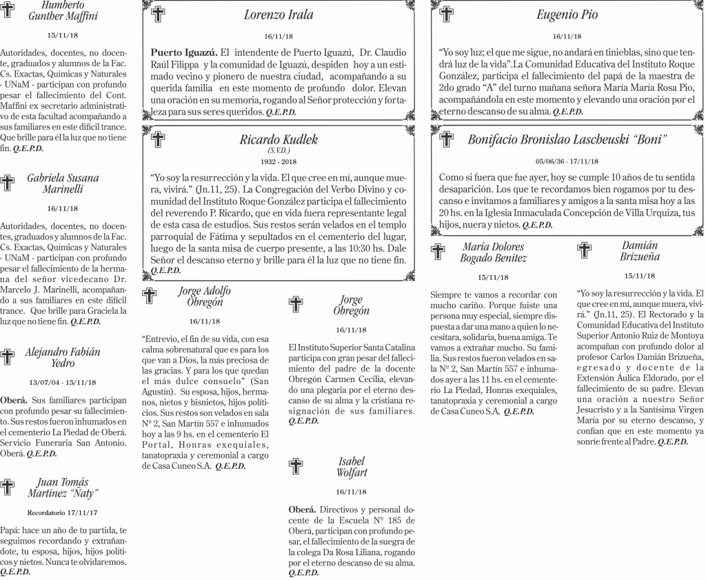 Fúnebres del sábado 17 de noviembre de 2018