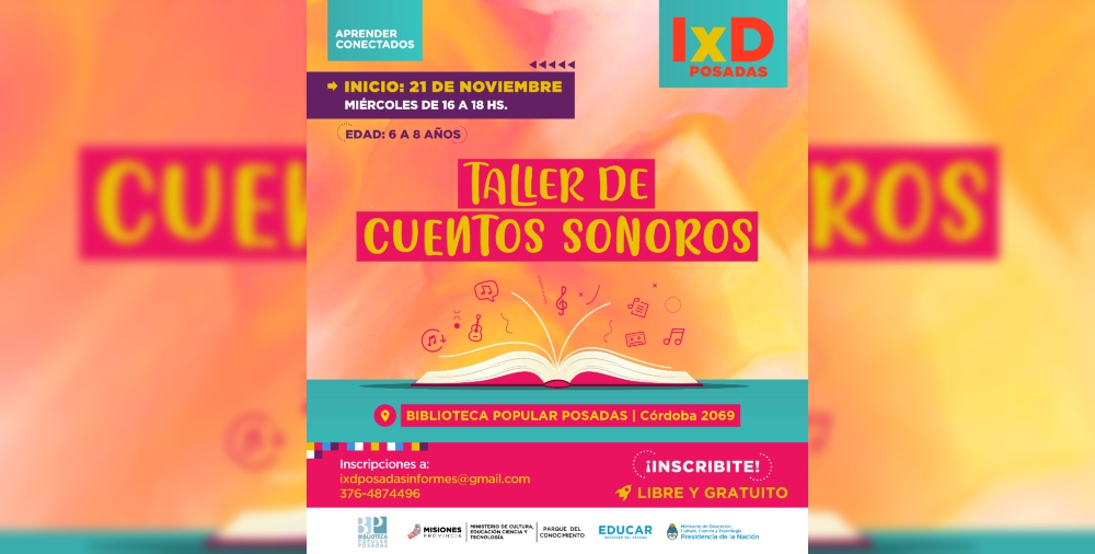 Este taller, organizado por IxD Posadas y Biblioteca Popular Posadas, será un espacio lúdico-educativo que permitirá abordar la importancia del cuento como recurso literario. Además, estará acompañado de actividades que motivarán el desarrollo de la expresión corporal, musical y oral.