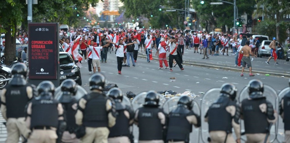 Después de que se confirmara la postergación del encuentro, la gente de River empezó a desconcentrarse, pero a unas pocas cuadras del estadio, en el cruce de las avenidas Del Libertador y Congreso, se producía una batalla campal entre simpatizantes del club de Núñez y agentes del orden.