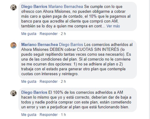 Barrios, en la tarde del martes, intercambió opiniones con un comprador que posteó en su cuenta de Facebook que le habían recargado intereses durante una compra con el Programa Ahora Misiones. El consumidor le reiteró en varias ocasiones que el precio de contado y el precio en cuotas debe ser el mismo, pero el empresario y dirigente de Cambiemos defendió su posición.