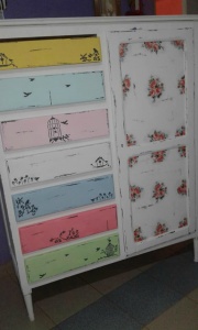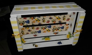 Todo lo que sea en madera puedo decorar: sillas, cajitas, cajones, muebles y también voy creando como el nuevo portapañuelos de lata de leche.
