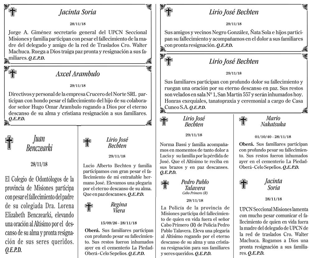 Fúnebres del viernes 30 de noviembre de 2018