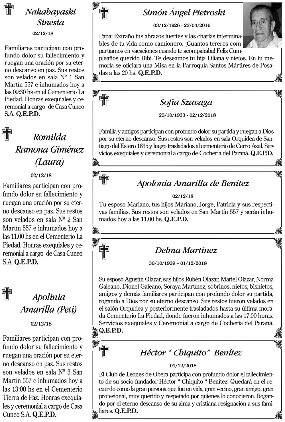 Fúnebres del lunes 3 de diciembre de 2018