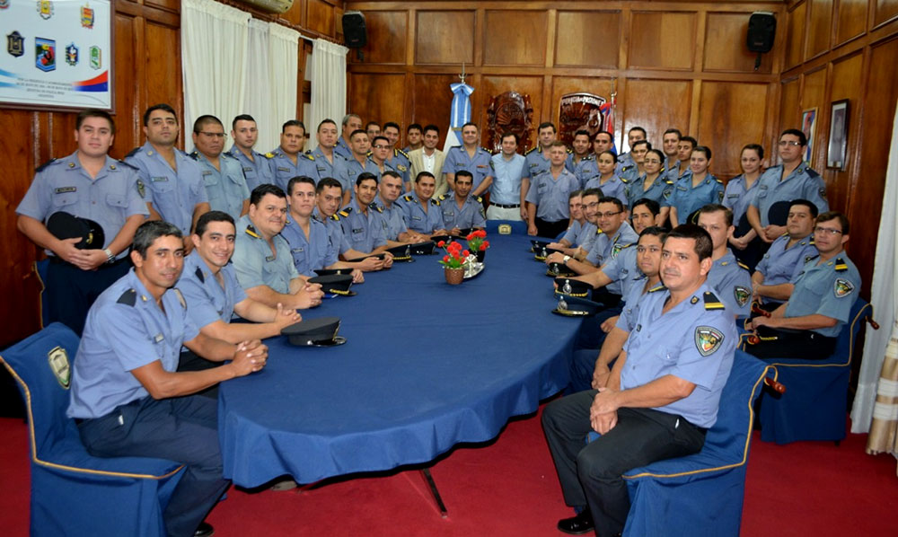 El subsecretario de Seguridad y Justicia, Pedro Ariel Marinoni y el coordinador de Gabinete del Ministerio de Gobierno, Juan María Quintana junto al jefe de Policía comisario general José Mazur y el subjefe comisario general José Roberto López saludaron e hicieron una mención especial a cada músico que no sólo engalanan los actos institucionales sino además a cada evento social al que son invitados por su prestigiosa calidad artística e histórica trayectoria.