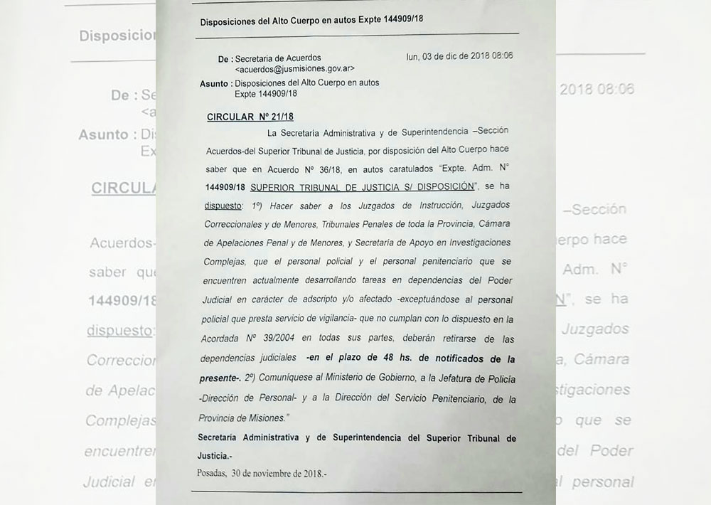 La disposición de los ministros del STJ dice expresamente: “La Secretaría Administrativa y de Superintendencia, -sección acuerdos del STJ-, por disposición del Alto Cuerpo, hizo saber mediante el acuerdo 36/18 (autos caratulados expediente administrativo 144909/18), que se dispuso: 1) hacer saber a los Juzgados de Instrucción, Juzgados Correccionales y de Menores, Tribunales Penales de toda la provincia, Cámara de Apelaciones Penal y de Menores y Secretaría de Apoyo para las Investigaciones Complejas (SAIC), que el personal policial y penitenciario que se encuentren actualmente desarrollando tareas en dependencias del Poder Judicial en carácter de adscripto y/o afectado -exceptuándose al personal policial que presta servicio de vigilancia- que no cumplan con lo dispuesto en la acordada 39/2004 en todas sus partes, deberán retirarse de las dependencias judiciales en el plazo de 48 horas de notificados de la presente. 2) comuníquese al Ministerio de Gobierno, a la Jefatura de Policía -Dirección de Personal-y a la Dirección del Servicio Penitenciario, de la provincia de Misiones”.