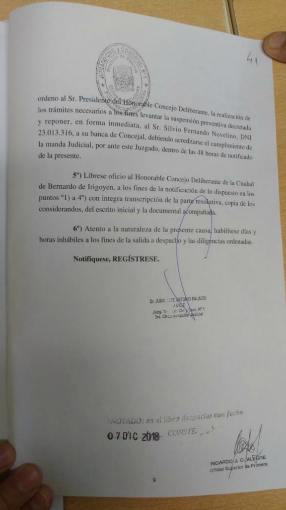 El juez Juan José Palacio fue el encargado de dictar la resolución que hace lugar a la medida cautelar presentada por Novelino y ordenó así “al Presidente del Concejo Deliberante la realización de los trámites necesarios a los fines de levantar la suspensión preventiva decretada y reponer, en forma inmediata, a Silvio Fernando Novelino a su banca de Concejal, debiendo acreditarse el cumplimiento dentro de 48 horas de notificación”.