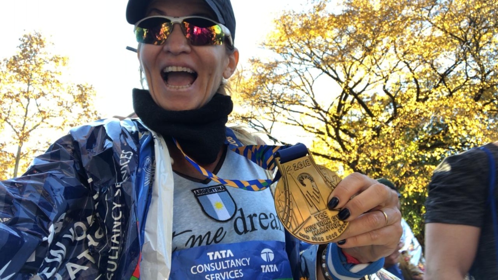 “Durante la carrera uno pasa por todos los estados, arranqué con miedo, porque todos me decían ‘andá despacio, no gastes toda la energía de entrada’, era la primera vez en mi vida, nunca había estado en algo de tantas dimensiones, había 50 mil personas corriendo, era una cosa de locos, una ola humana que uno veía cruzando puentes; en la mitad vas agarrando el gusto y te vas divirtiendo, después el cansancio y se empieza a ver que la gente que comienza a lesionarse, que tiene que salir; me pasó que en el kilómetro treinta tuve una contractura en un glúteo, me faltaban doce kilómetros, pero ellos te dan unos palitos con crema, me la pasé como pude, era un gel frío que me ayudó un poco y me mentalicé que no tenía que pensar en el dolor, entonces fue todo el tiempo el poner la cabeza en otro lugar; y después el final, es algo de locos, ves gente que está a dos kilómetros y no puede más y tiene que salir, delante mío venía un chico que le agarró un temblor en el cuerpo y no pudo seguir, todos tratábamos de alentarlo, lo agarrábamos de un lado y del otro porque faltaba nada, pero a veces el cuerpo no te responde, uno entrena y hace todo, pero a veces también es necesaria esa cuota de suerte”, describió la maratonista.