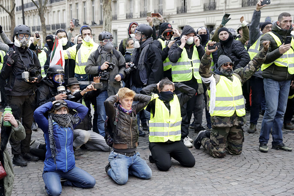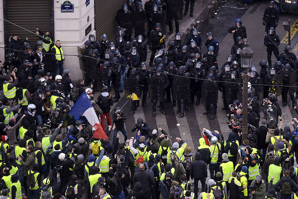 Al mismo tiempo, en la avenida de los Campos Elíseos, algunos chalecos amarillos incendiaron cestos de residuos y contenedores, a lo que la policía respondió desplazando a los manifestantes y con algunos arrestos esporádicos.