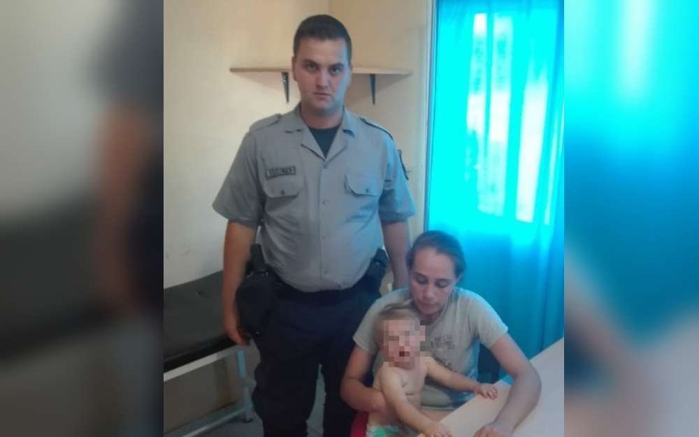 A las 14.20 efectivos de la seccional 2ª se hicieron presente en una vivienda de ese barrio donde una joven madre pedía ayuda porque su hijo de 1 año se cayó de la cama y tenía dificultades para respirar .