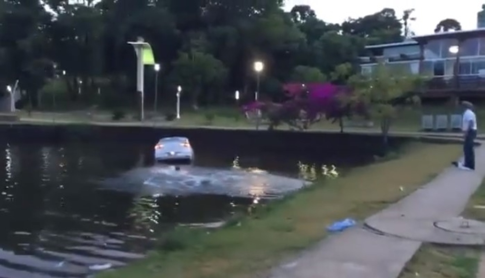Hoy a las 7, el conductor de un Volkswagen Voyage con patente de la localidad de Dionisio Cerqueira, perdió el control de la unidad y terminó semisumergido en las aguas del lago.