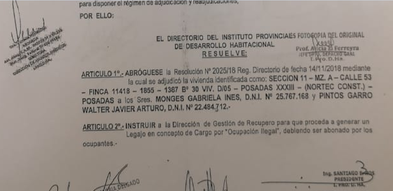 El lunes, Domínguez recibió la cédula de notificación del Iprodha donde le confirmaron la revocatoria de la adjudicación al funcionario provincial y el inicio de los trámites para su tenencia.