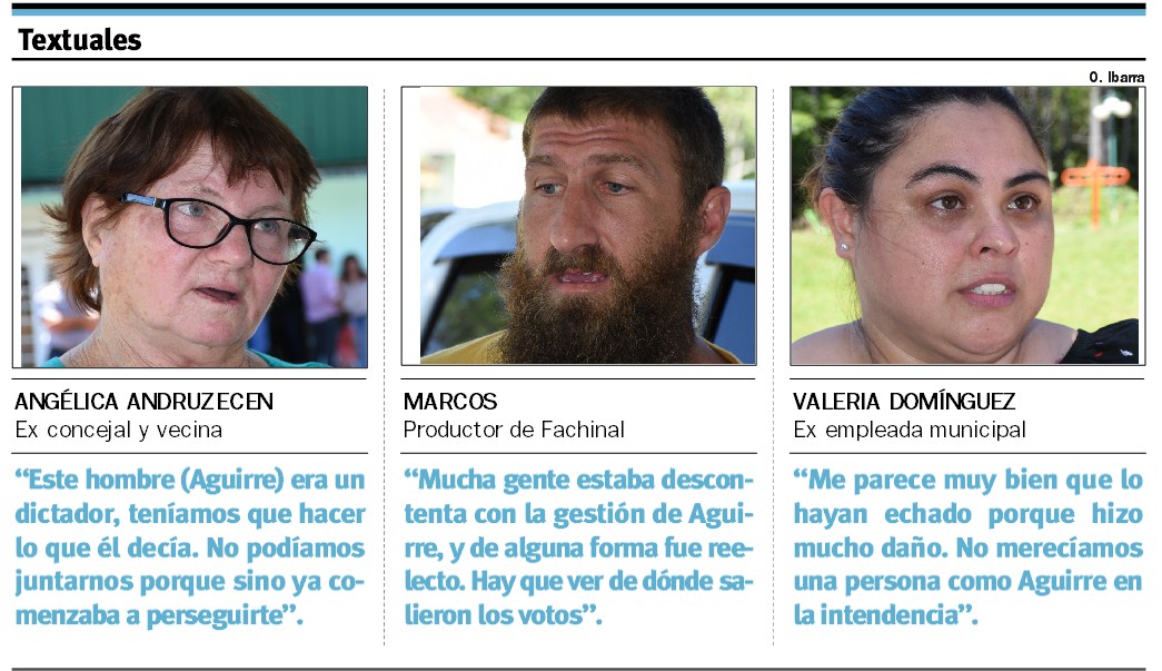 Vecinos de Fachinal apoyaron lo actuado por el Concejo Deliberante y esperan que la destitución del intendente, José Rafael Aguirre, tenga un impacto positivo en el pueblo. “Este hombre era un dictador, teníamos que hacer lo que él decía. Los vecinos no podíamos juntarnos porque ya comenzaba a perseguirnos”, advirtió Angélica Andruzecen, ex edil de la comuna.