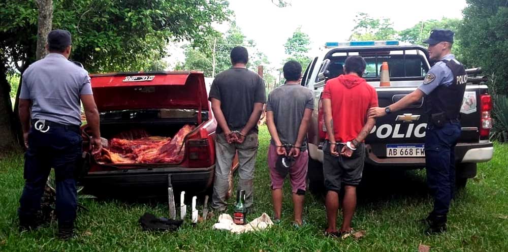 Los efectivos realizaban recorridas en la zona, cuando sorprendieron a los hombres carneando un animal de unos 350 kilos, luego se confirmó que el mismo había sido sustraído de un potrero cercano.