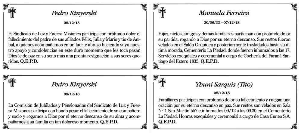 Fúnebres del domingo 9 de diciembre de 2018
