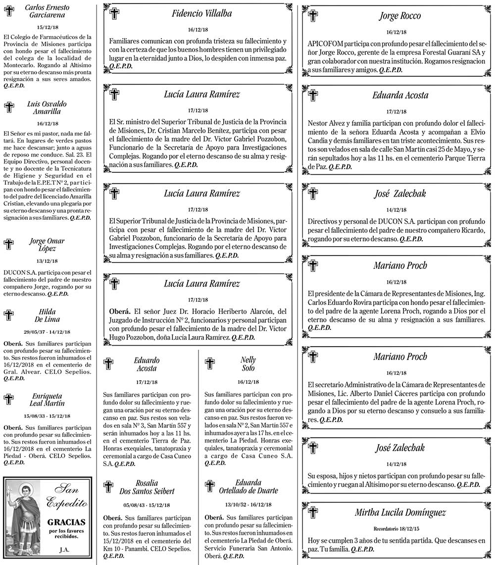 Fúnebres del martes 18 de diciembre de 2018