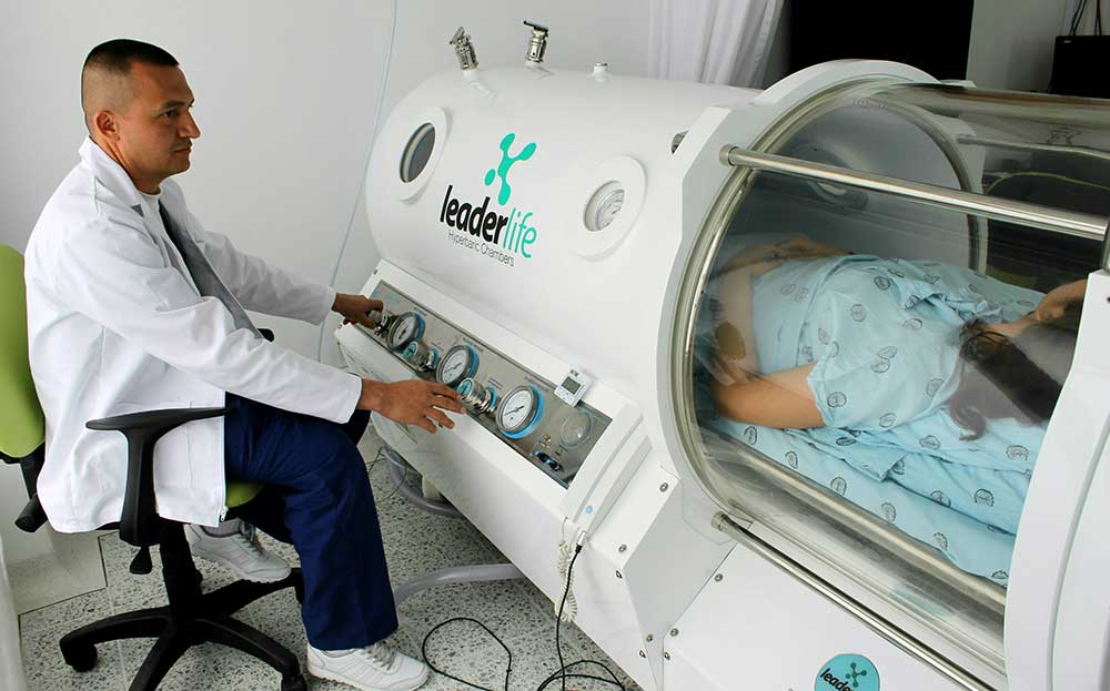 El paciente ingresa a una cámara hiperbárica presurizada a un mínimo de 1.4 atmósferas ATM (superior a la presión atmosférica ambiental normal que es de 1 atmósfera) y mediante una máscara se le administra oxígeno cercano al 100%. Este gas se transporta a la sangre, y logra alcanzar incluso a los tejidos dañados.