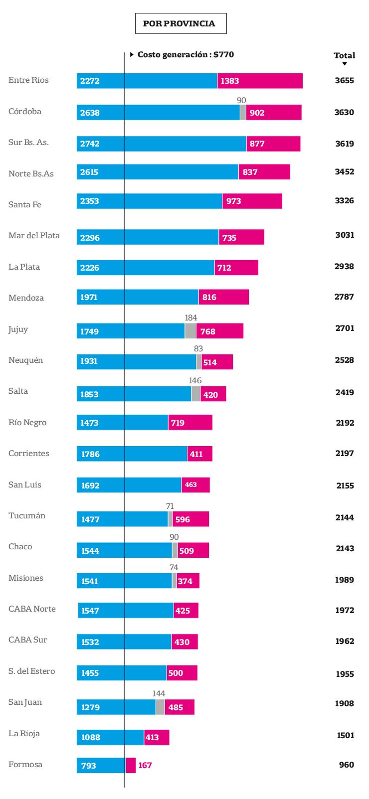 Le sigue Chaco con una factura de $2.147, con $1.554 en generación y distribución, $90 en impuestos y $596 en el VAD. Luego está Corrientes, donde una factura de 500 kilovatios/hora cuesta $2.197, con $1786 por los gastos de distribución y $411 por impuestos.