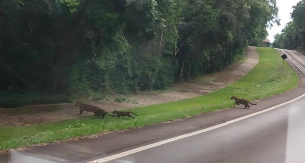 La escena sorprendió a los turistas que circulaban en un vehículo por la ruta de acceso al área Cataratas, en el Parque Nacional do Iguazú, del lado brasileño: cuatro yaguaretés desfilando delante de ellos.
