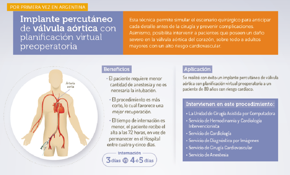 BUENOS AIRES. En el Instituto de Medicina Cardiovascular del Hospital Italiano de Buenos Aires se realizó un implante percutáneo de válvula aórtica con planificación virtual. Es el primero de este tipo en Argentina. De esta forma, lograron anticipar el escenario quirúrgico, decidir con precisión aspectos fundamentales de la cirugía y predecir y prevenir posibles complicaciones.