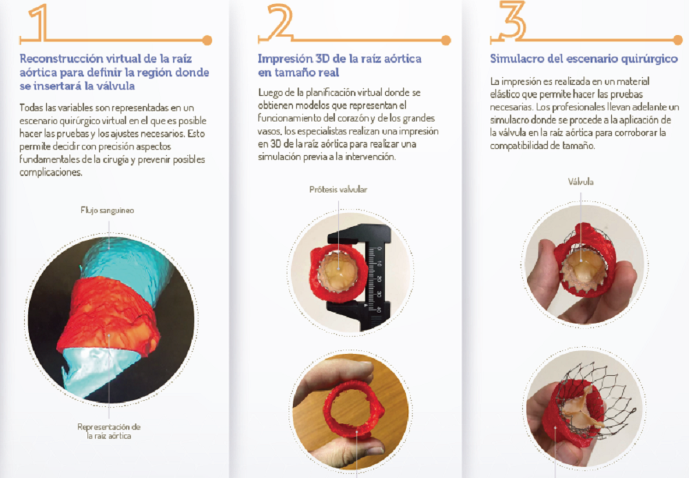 Este novedoso avance es el resultado de un trabajo coordinado entre profesionales de diferentes disciplinas. Especialistas en giagnóstico por imágenes realizan y analizan estudios complejos y con alta calidad que brindan información detallada de la situación de salud de los pacientes, mientras que en la Unidad de Cirugía Asistida por Computadora traducen esta información para obtener modelos que representan el funcionamiento del corazón y de los grandes vasos, luego realizan una impresión 3D en material elástico que permite hacer las pruebas necesarias. Con todas estas herramientas, los médicos del servicio de Hemodinamia y Cardiología Intervencionista, con el aporte de Cardiología, Cirugía Cardiovascular y Anestesia, estudian el caso, definen el tratamiento y planifican el paso a paso de la cirugía.