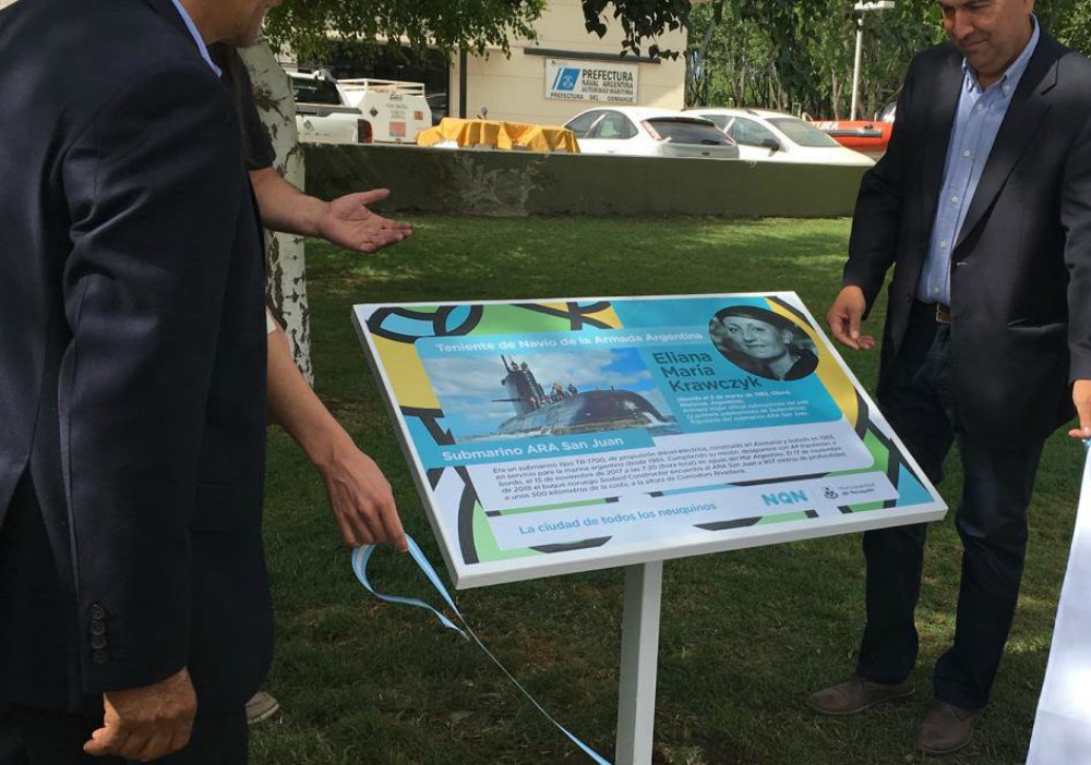La Municipalidad de Neuquén capital nombró a dos calles de la zona conocida como “Isla 132” con los nombres “ARA San Juan” y “Teniente de Navío Eliana María Krawczyk”, en homenaje a los 44 tripulantes del submarino argentino desaparecido hace 14 meses.