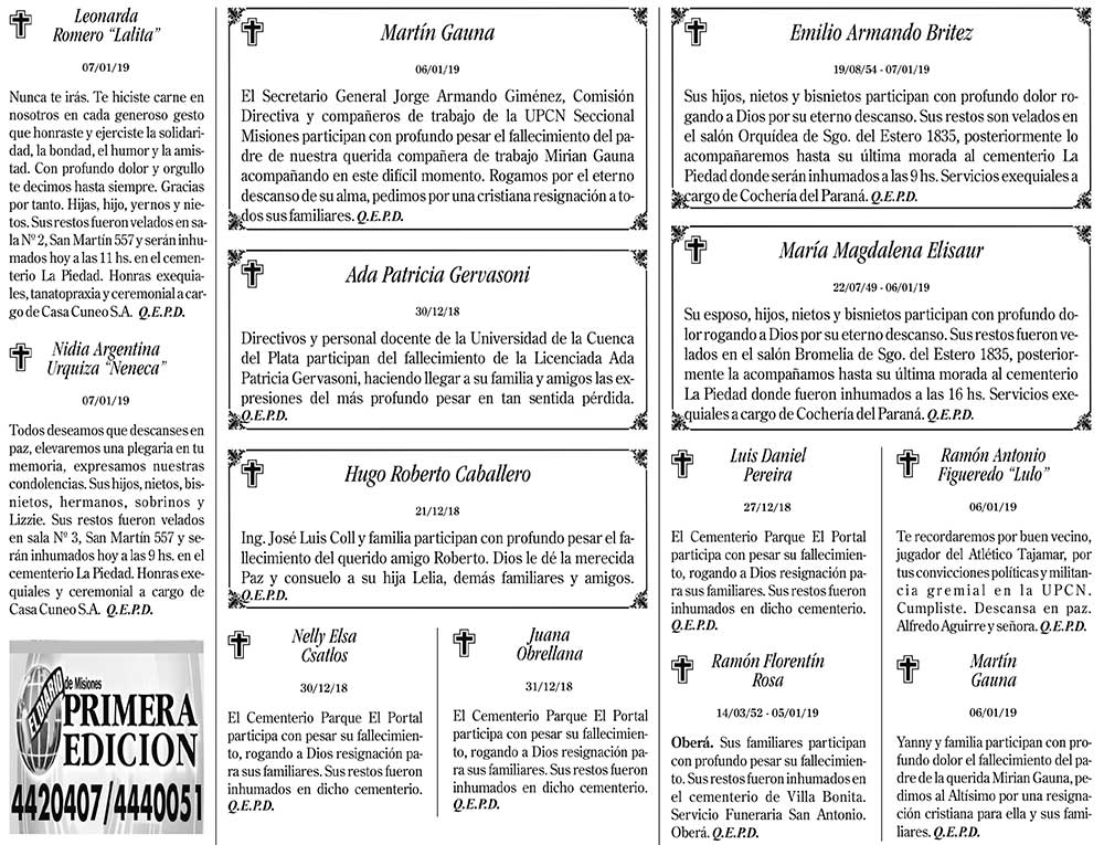Fúnebres del martes 8 de enero de 2019