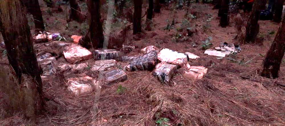 Fue así como se descubrieron 128 paquetes de gran tamaño y ocho bolsas de arpillera ocultos entre ramas y restos de pinos.