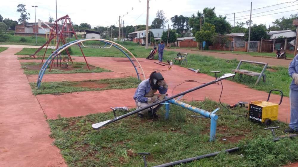 Empleados de la municipalidad de Posadas repararon y pintaron las hamacas, el tobogán y el sube y baja de la plaza del barrio 2 de Abril. También instalaron malla sima para la cancha de fútbol.