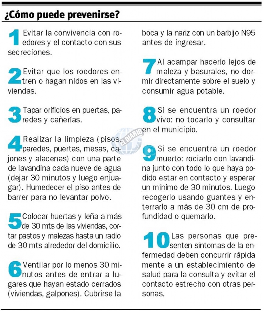 En relación a las medidas preventivas, Méndez destacó el mantener medidas higiénicas “más reforzadas” como aireación, ventilación de las habitaciones, que entre algo de sol “porque el virus es muy lábil”, en el caso de hacer limpiezas de áreas cerradas con gran cantidad de polvo airearlos previamente no menos de 30 minutos, que la limpieza se haga en forma húmeda y fundamentalmente con agua de lavandina: “un balde de diez litros de agua con un pocillo de lavandina es muy útil porque tiene alta efectividad para eliminar el virus”. En la casa tapar cualquier agujero por donde estén entrando roedores, mantener una adecuada limpieza, manejar bien los residuos, cerrarlos en bolsas y evitar que estos se rompan y desparramen en la vereda o peridomicilio. “Si encuentran algún roedor muerto no debe ser manipulado con la mano, sino que se deben utilizar guantes y descartarlo dentro de una bolsa de residuos para su correcto desecho. Esas cosas son importantes a tener en cuenta”.