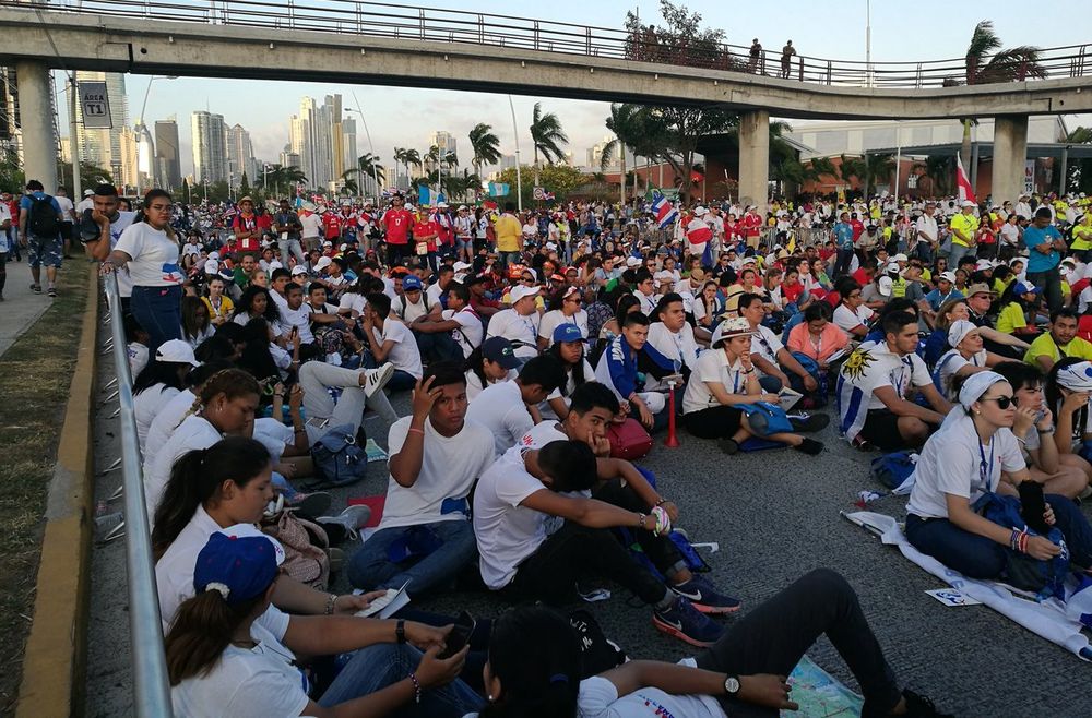 Miles de peregrinos, cubiertos de banderas, invadieron Ciudad de Panamá y esperan la llegada del papa cantando y haciéndose selfis a orillas del Océano Pacífico.