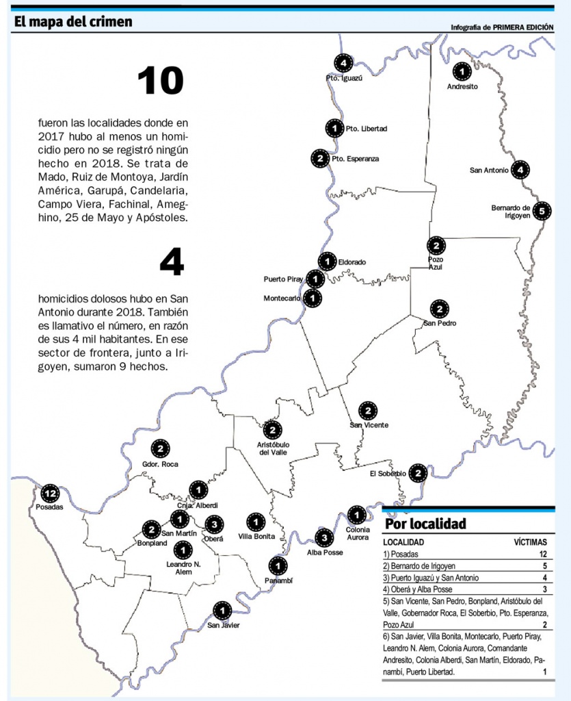 Sobre las otras dos ciudades de mayor población en la provincia, el denominado “mapa del crimen” de PRIMERA EDICIÓN arroja que Oberá registró también 3 hechos, aunque con casi 100 mil habitantes en la jurisdicción. En Eldorado, con cerca de 70 mil habitantes, el descenso fue marcado: en 2017 hubo cinco homicidios, pero en 2018 apenas uno.