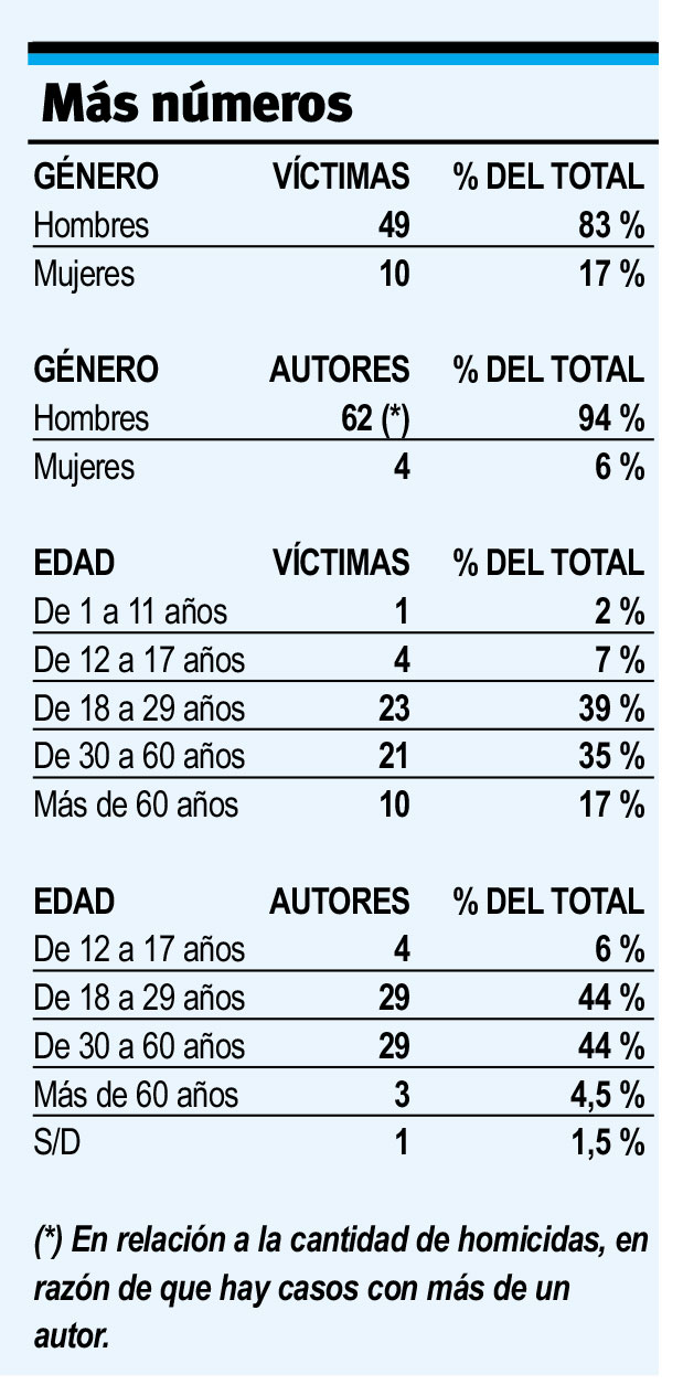 Con respecto a los horarios y días en que se cometieron los crímenes, 2018 marcó los mismos números que años anteriores. Más de la mitad de los hechos tuvieron lugar entre sábados y domingos. Fueron 32 casos que equivalen ni más ni menos que al 54% del total. Y en lo referente al reloj, una cifra similar: de noche, entre las 18 y las 6, hubo 40 homicidios sobre los 59 del total, un abultado 67,5% que supera por lejos a las horas de sol.