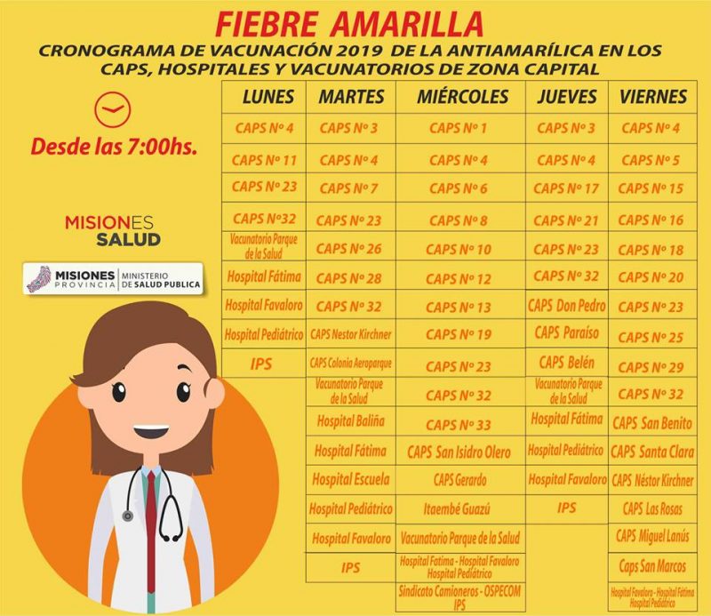 El Ministerio de Salud Pública de Misiones detalla en su página web los días, horarios y centros y hospitales donde pueden aplicarse la vacuna antiamarílica.