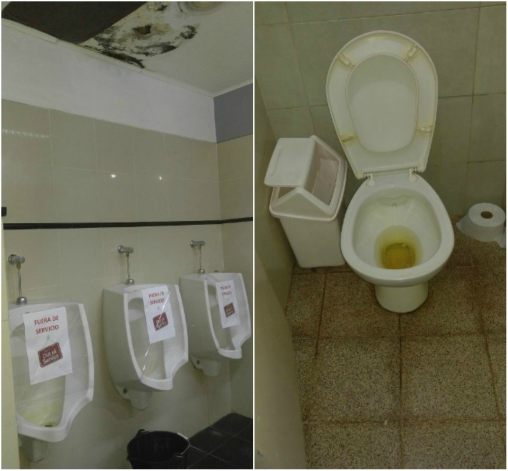 Es que las fotografías reflejan cómo todos los urinarios estaban “fuera de servicio” al mismo tiempo y los inodoros presentaban problemas de desagote, además de la ausencia de elementos básicos como portarrollos de papel higiénico. Para colmo, parte del techo del baño público estaba roto o en evidente deterioro.