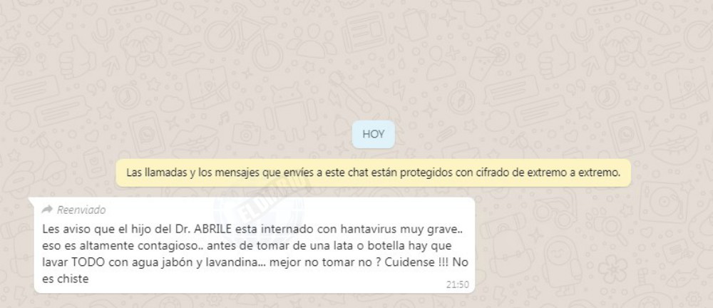 “Les aviso que el hijo del Dr. ABRILE esta internado con hantavirus muy grave.. eso es altamente contagioso.. antes de tomar de una lata o botella hay que lavar TODO con agua jabón y lavandina… mejor no tomar no ? Cuidense !!! No es chiste” señala la cadena que fue compartida cientos de veces.