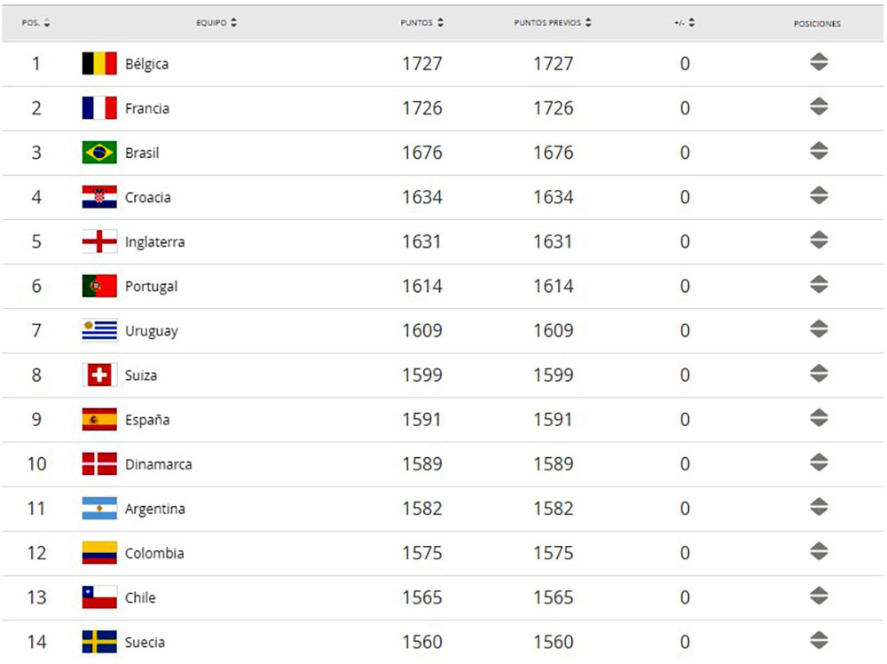 En dos meses, la jerarquía mundial del fútbol no se ha alterado. Los Diablos Rojos de Eden Hazard preceden en lo alto de la clasificación a Francia y a Brasil en un Top 20 sin cambios.